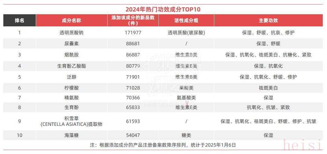 年度TOP10成分:玻尿酸断崖式领先,美白成分持续火爆