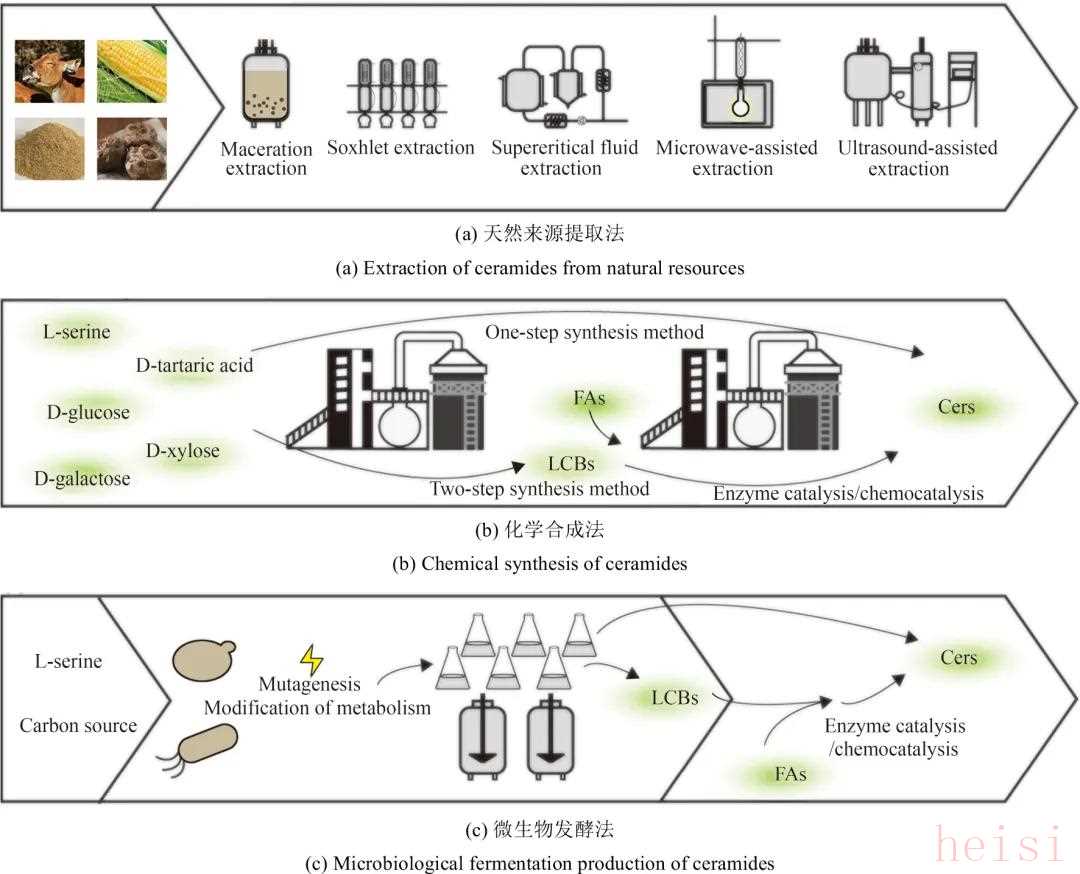目前市场上神经酰胺合成方法有天然提取法、化学合成法和微生物发酵法,其中前二者存在纯度低、杂质复杂等问题,而微生物发酵法因环境友好、条件温和、操作简便等优势,日益受到青睐。