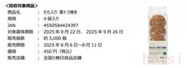 根据良品计划公司给出的召回通报,本次召回的商品为4个装栗子铜锣烧,保质期至2025年9月22日和2025年9月26日,召回商品个数约3000个,销售日期在2025年8月6日至8月11日,销售店铺为日本境内的无印良品商店。