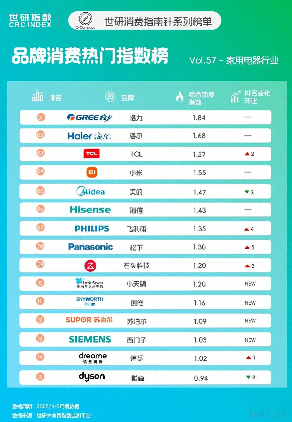 本次监测周期内,格力、海尔和TCL分别以1.84、1.68和1.57的综合热度指数位列榜单Top3。