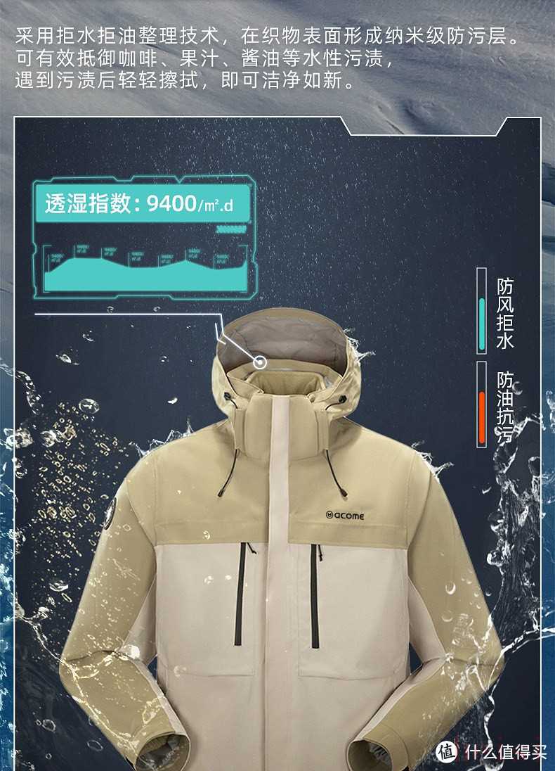这可是加厚的鹅绒内胆的冲锋衣,当然防水等级差些,只有小雨等级的防水,透湿指数也在5400上下,至少不虚标,比较实在的数据,毕竟是21年就出的,年年的经典款