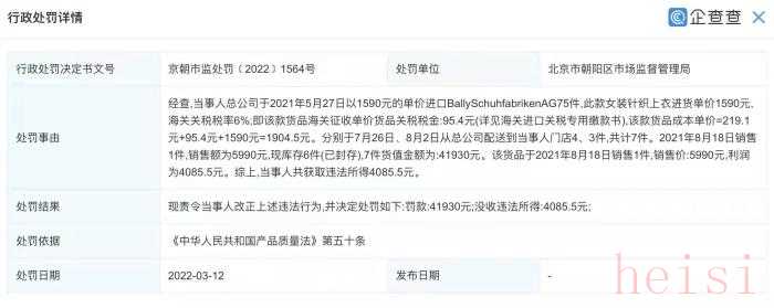近日,Bally关联公司巴丽(上海)商业有限公司北京分公司因违反《中华人民共和国产品质量法》第三十九条,被北京市朝阳区市场监督管理局罚款41930元,没收违法所得4085.5元。