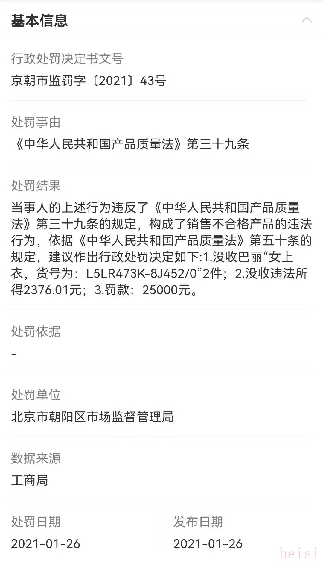 巴丽(上海)商业有限公司北京分公司行政处罚详情。 企查查截图。