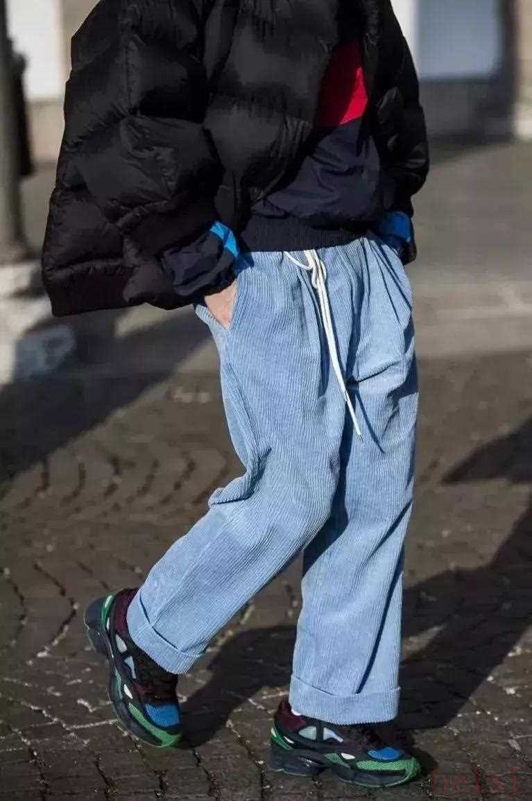 因为像灯芯绒这种本来就不能保持裤型的面料,选择太拘谨的修身版型反而没街头风那味,倒是宽松版型还会多几分飘逸感。