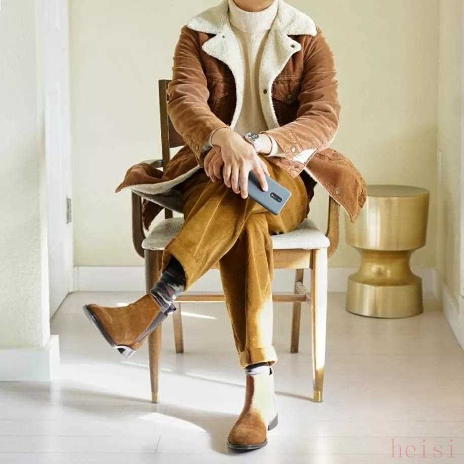 特别是搭配麂皮、反绒皮这类质感丰富的材质,跟灯芯绒裤保持视觉上的和谐之余,也契合了冬日穿搭要求的温暖氛围。
