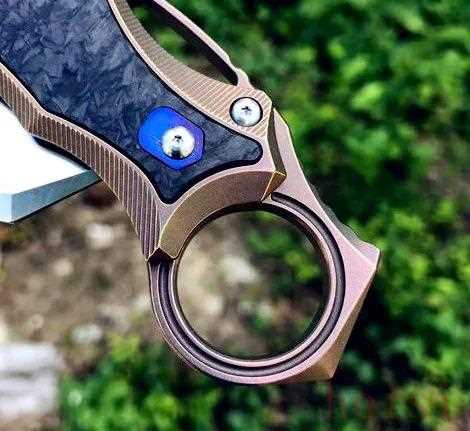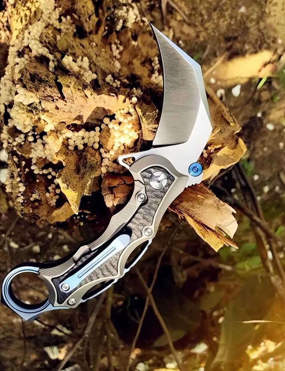 柄材选用了6Al4V钛加碳纤维贴片。6Al4V钛合金是一种轻质且高强度的金属材料,具有良好的抗腐蚀性和生物相容性。它的使用使得刀柄重量减轻,方便携带的同时,又保证了刀柄的强度。而碳纤维贴片的加入,则为刀柄增添了一份独特的质感和时尚感。碳纤维具有高强度、低密度的特点,并且其外观有着独特的纹理,使得每一把魔裂爪的刀柄都仿佛拥有独一无二的“皮肤”。