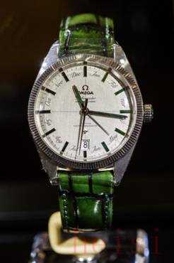 41毫米950铂金表壳,喷砂950铂金“派盘”表盘,白色18K金指针嵌有绿色珐琅,墨绿色皮表带,欧米茄8923同轴至臻天文台年历机芯,全球限量发行52枚。