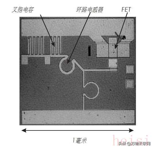 GaAs IC开发正在加速发展,1976年,RS Pengelly和JA Turner 报道了首个使用场效应晶体管的单片微波集成电路或MMIC,如图1.2所示。该MMIC采用单个1μm栅极长度MESFET和单个金属层形成单匝环路电感器和交叉指型电容器,在7至12 GHz范围内呈现出几dB(分贝)的增益,并推动了全球范围内GaAs MMIC行业的增长。