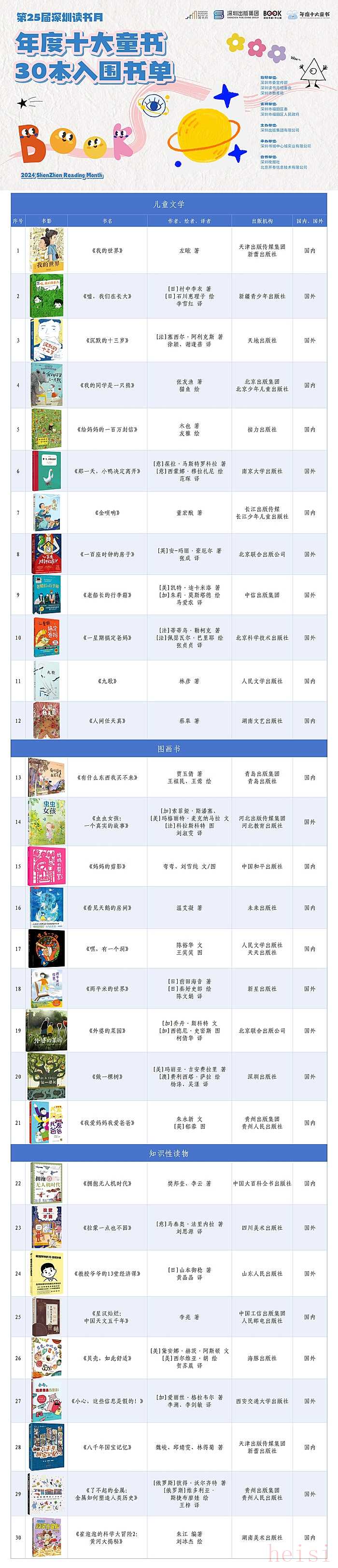 第二十五届深圳读书月“年度十大童书”30强入围书单正式发布啦!“年度十大童书”评选活动由深圳市委宣传部、深圳读书月组委会、深圳市教育局主办,深圳市福田区委、深圳市福田区人民政府支持,深圳出版集团有限公司承办,深圳书城中心城实业有限公司具体执行,合作单位为深圳晚报、北京开卷信息技术有限公司。