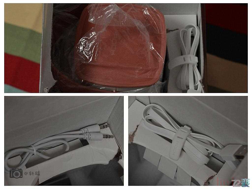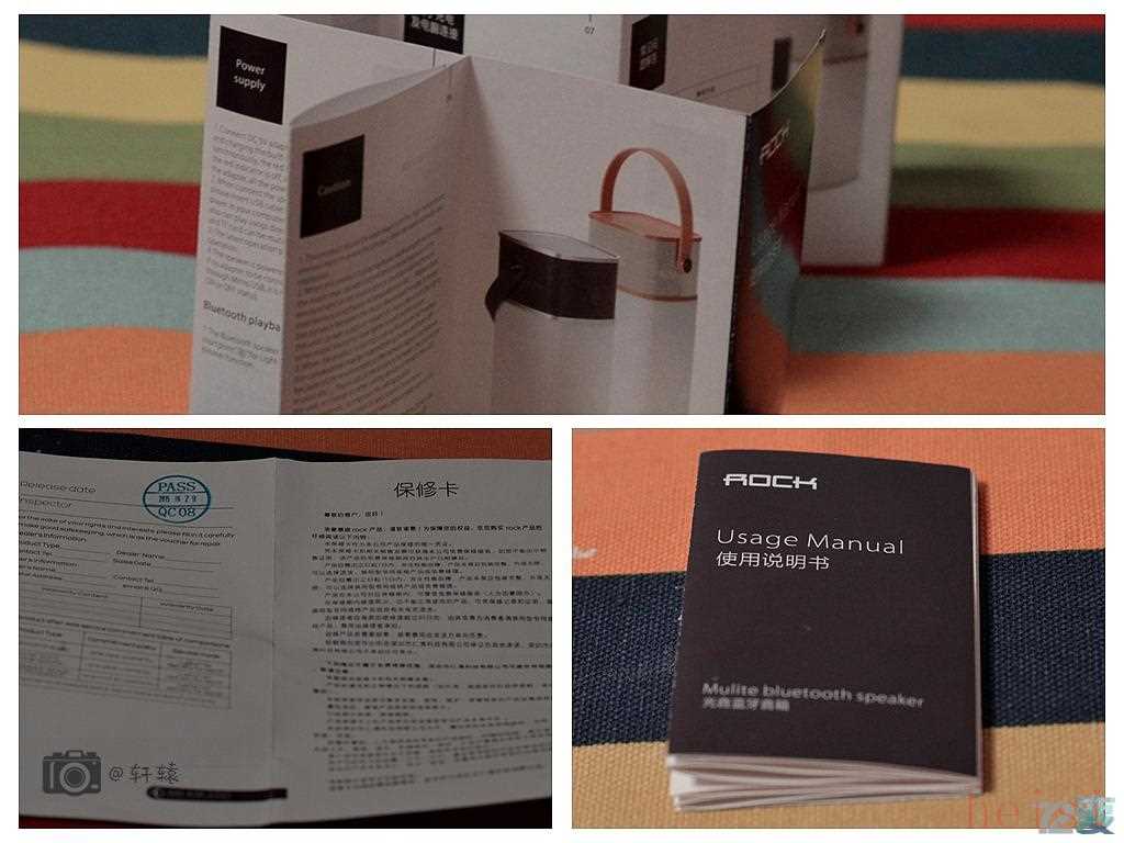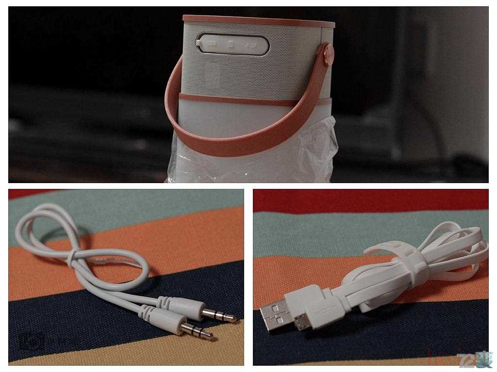 依次去除附件,音频线材略短,距离远一点的话恐怕够不到,不过有线连接用途很有限,毕竟现在电子设备蓝牙已然标配,并无大的影响,USB线材是mUSB接口,做工较为精致,处处可见Rock logo,属于定制线材,成本上要增加些,Rock并没有标配电源适配器,笔者看来并没有带来不便,因为标准的USB口充电已相当普及,谁手里没有3、5个5V1A/2A的电源适配器啊,相反在成本上会降低一些,相信厂家在市场售价上也会低一些,作为消费者得到实惠是最重要的。