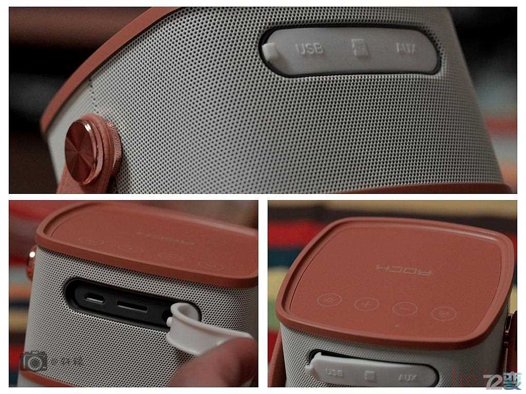 Rock上部音响部分侧面有个塑胶封条,盖子下面隐藏着USB接头、TF插槽以及音频接口,音频接口可以连接手机、电脑等音频输出设备,但USB接头只可充电,不具备数据传输功能,顶部看起来像是可乐杯盖,印刷有ROCK品牌LOGO,以及灯箱开关、音量+、音量-、多功能按键(开关机/暂停/接听),在按键下方是状态指示灯及充电指示灯,开机时控制面板上的LED灯会亮起,电量灯会闪烁,提示电量等信息。