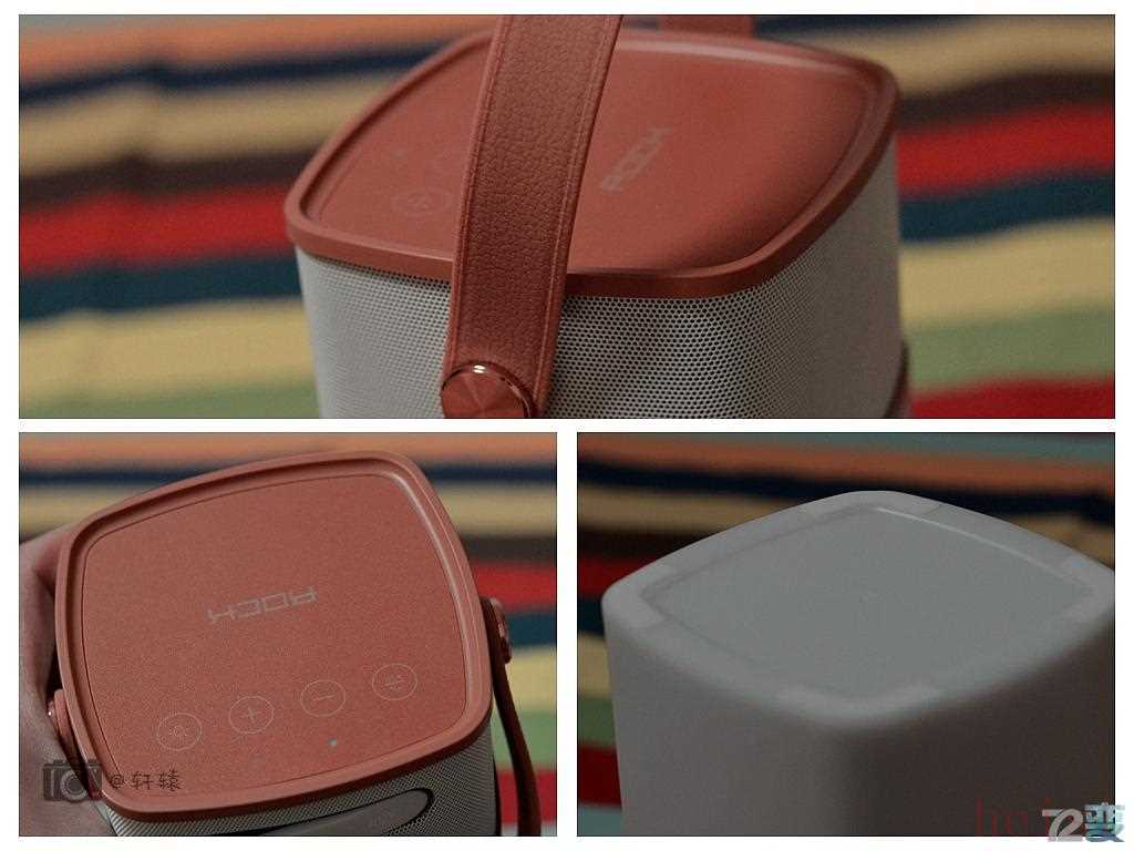 提手采用仿皮质处理,手感较好,金色大铆钉拉丝处理,用来固定提手,视觉上比较美观,Rock音箱站立在桌面上异常牢固,用手需要很费力才能推得懂,得益于底部的防滑脚垫设计,共4枚,通过双面胶粘合在底部。