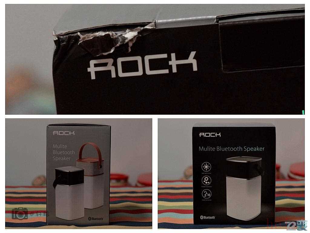 Rock光音蓝牙音箱外箱设计中规中矩,全英文印刷,Mulite Bluetooth Speaker,从外箱来看此款音箱共有黑色和棕色两种颜色。