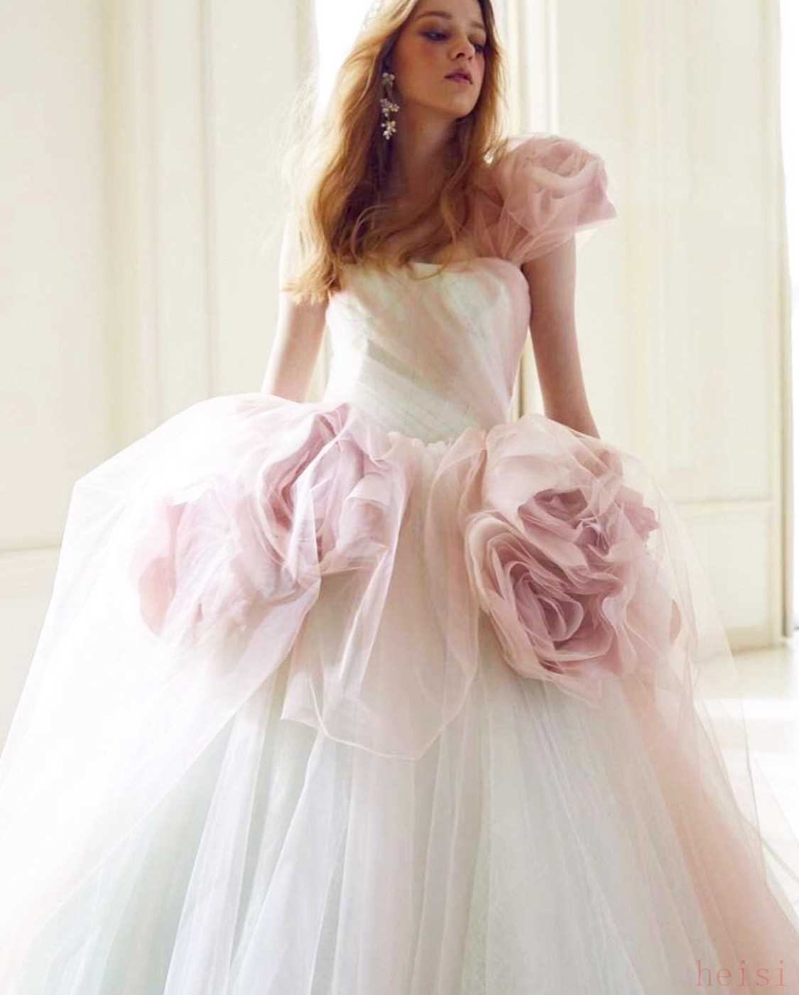 古典和现代的交融,白色褶皱和豆沙粉色系薄纱制作出一朵朵绚丽的花卉,在肩部和裙摆上带来如此甜美的气息,也在纯白的爱意中增添了少女的美丽。