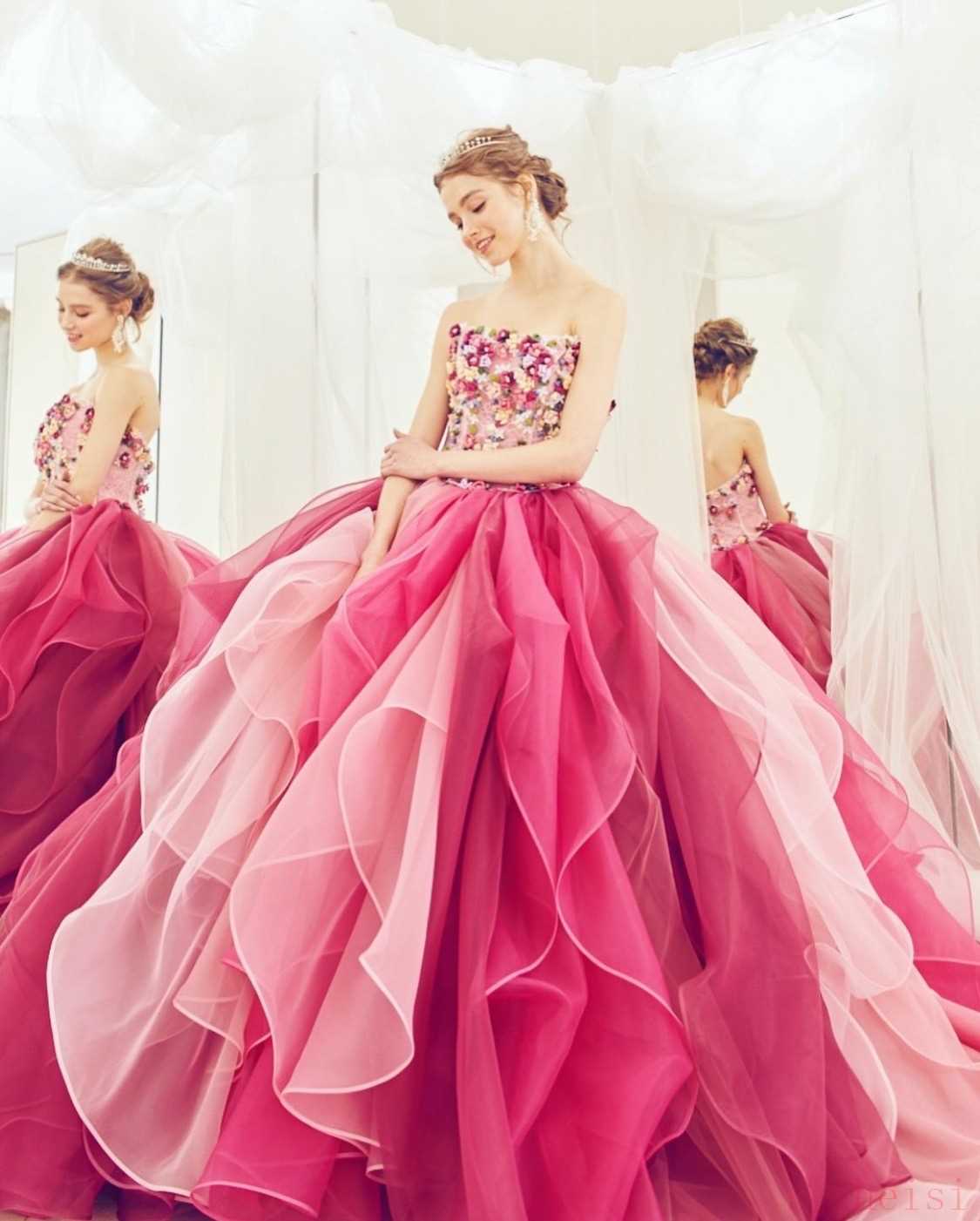 渐变雪纺花卉裙摆和蕾丝刺绣工艺,摇曳生姿的线条感以及细腻柔美的花枝,戴上王冠之后的小公主都是日系的甜美风格。
