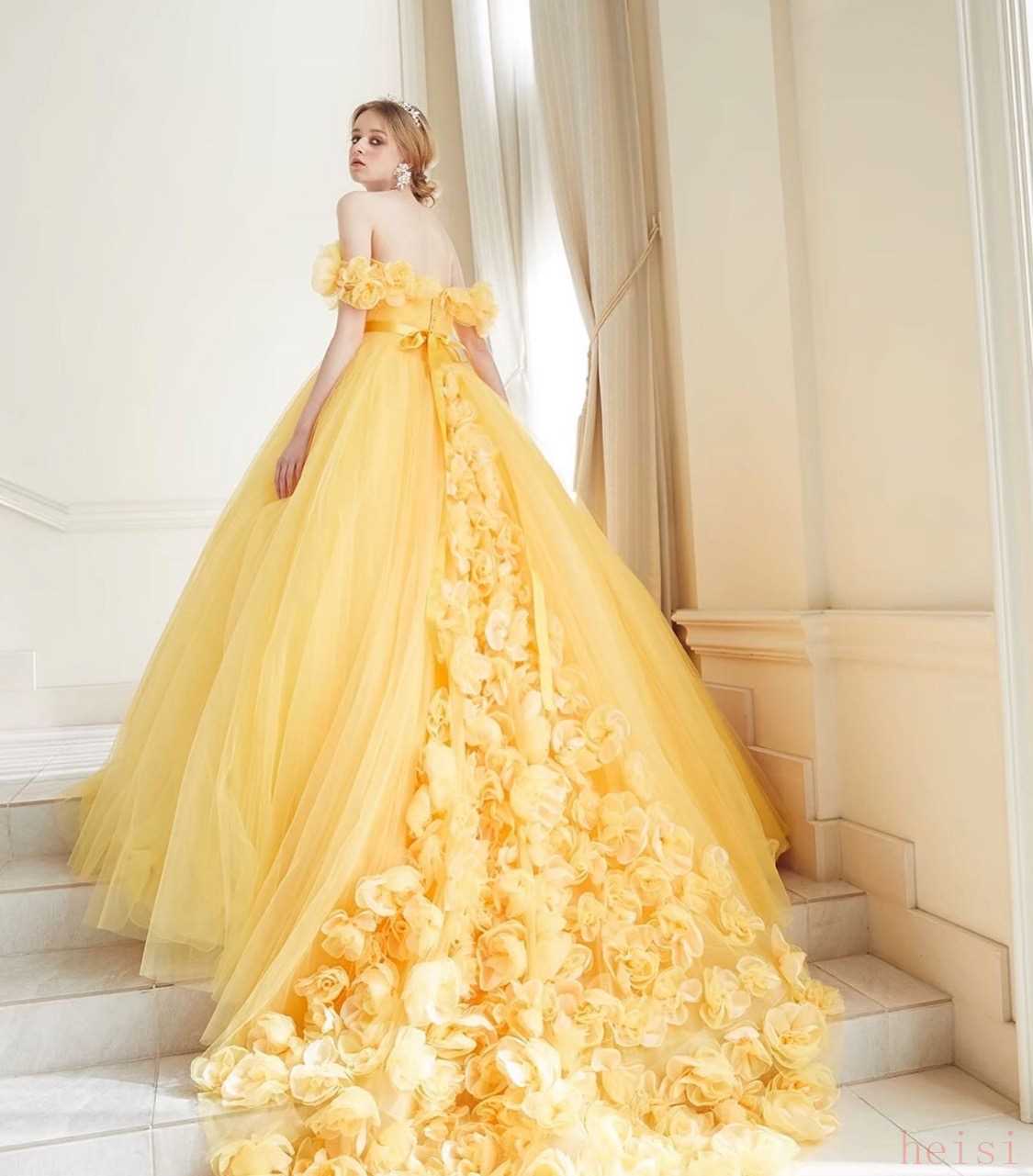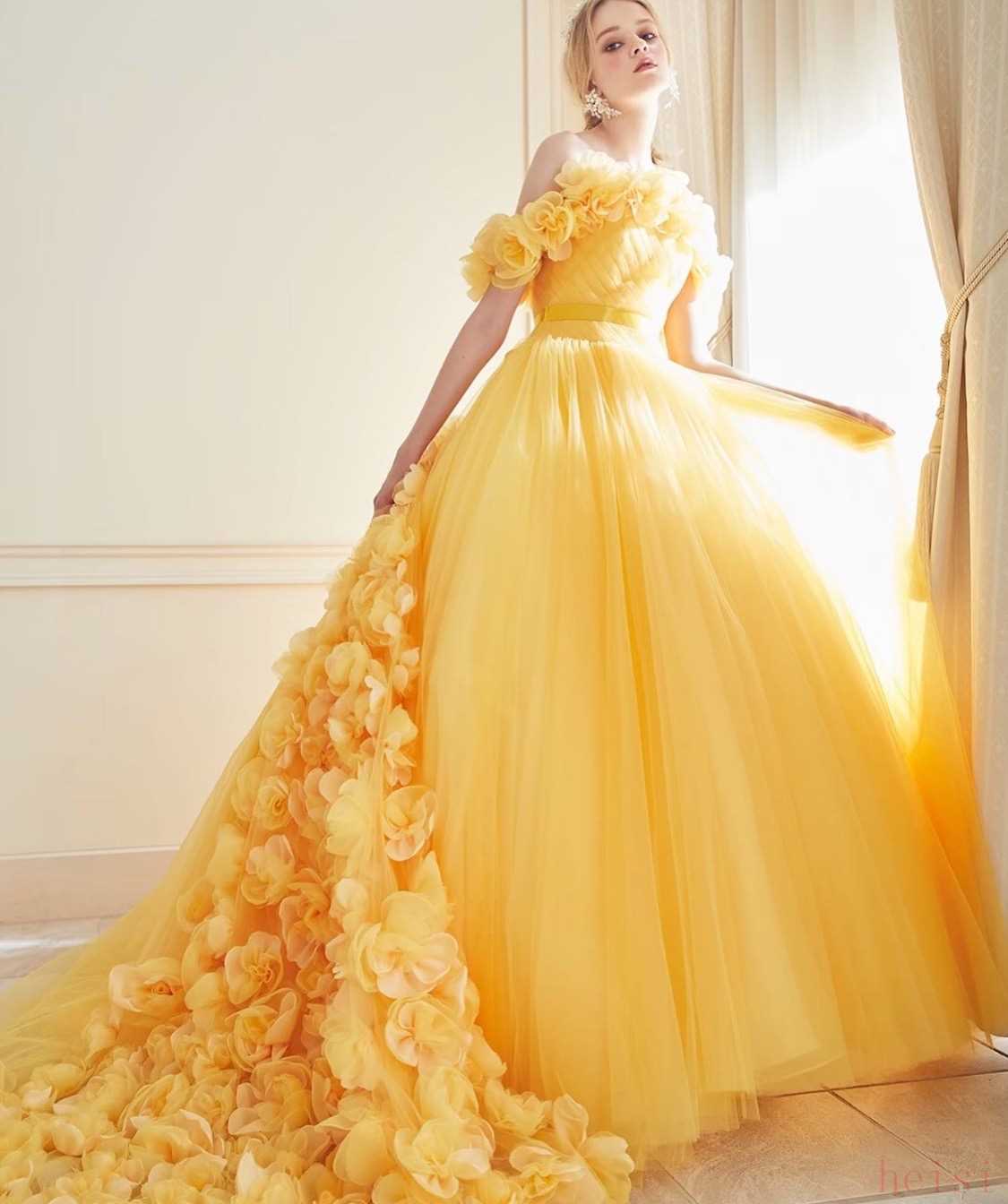 明媚又绚烂的黄色系高定婚纱礼服,虽然是同样的款式,但换了一个颜色之后整体风格都变了,从肩部延伸至裙摆处的花朵和薄纱融合在一起,仿佛是春季盛开的迎春花般亮眼又清新。