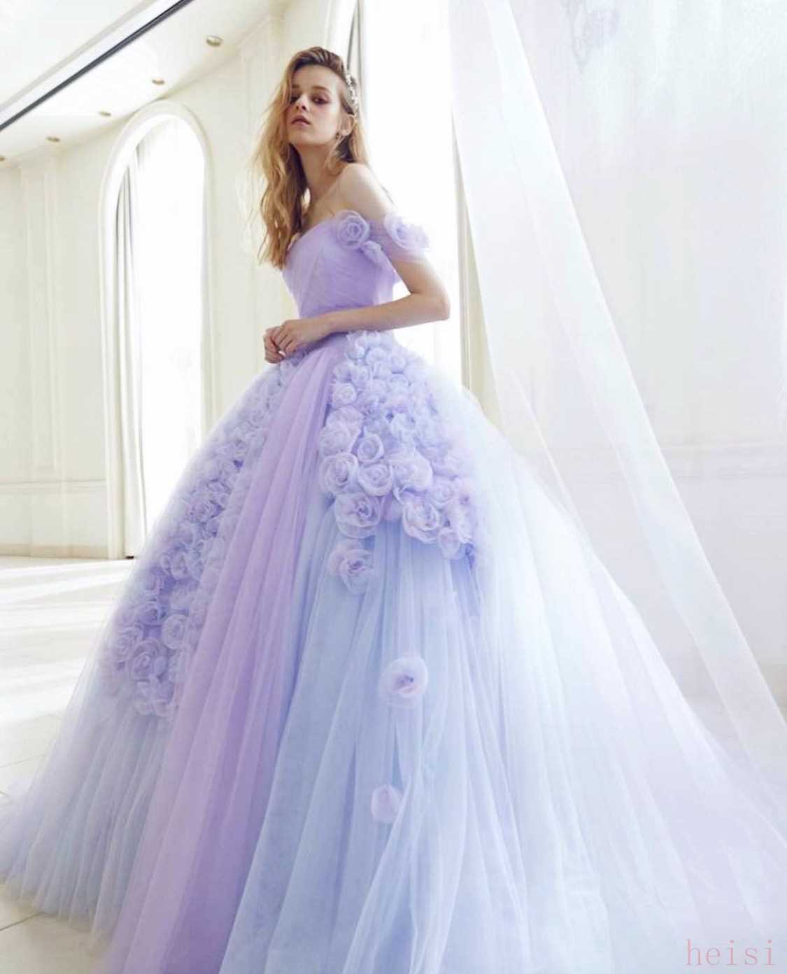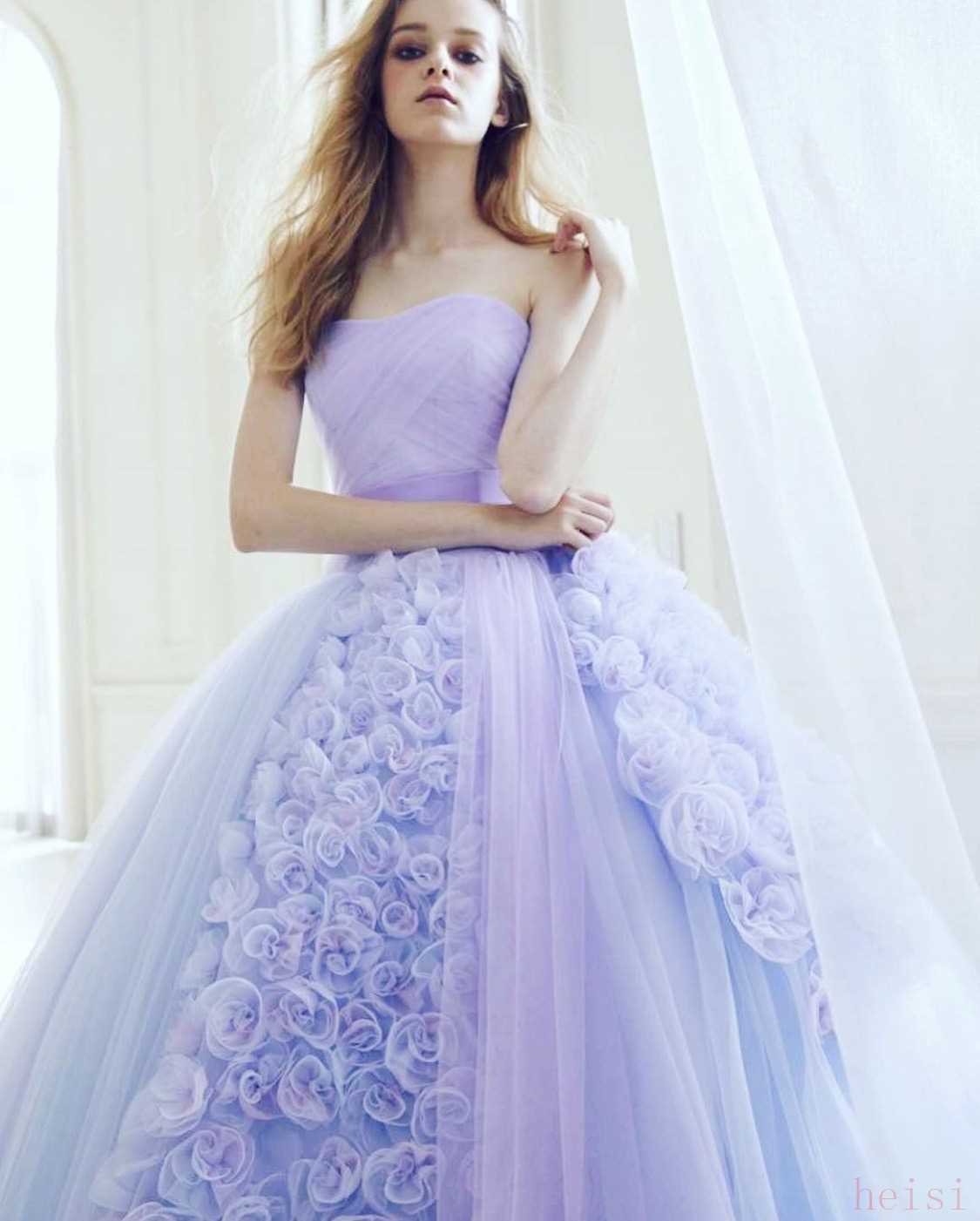 第一眼看到这件婚纱,感觉真的很清新!就好像是雨落在地上之后花瓣悄然绽放的美丽景象,柔美的天空和紫色玫瑰在裙摆上绽放处唯美的浪漫。