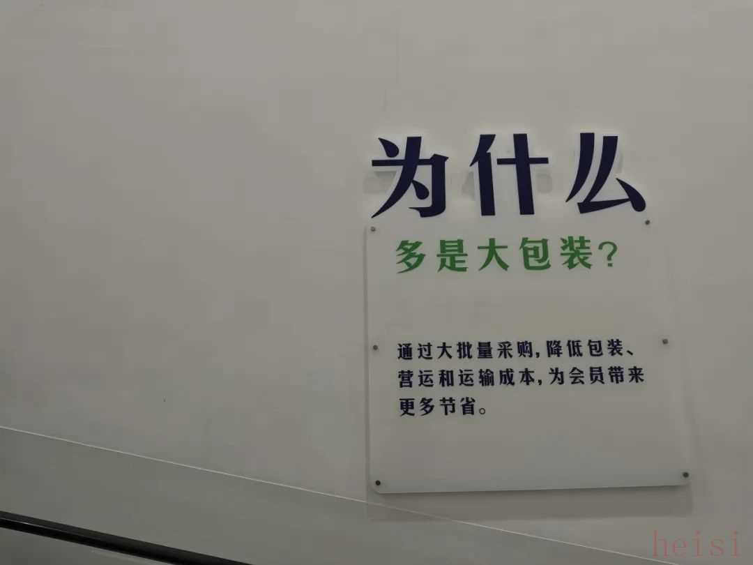 为什么店内多是大包装商品?山姆将原因贴在了入口墙上:“通过大批量采购,降低包装、营运和运输成本,为会员带来更多节省。”