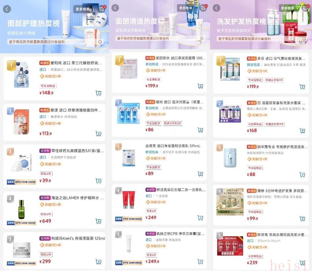 其中,面膜品牌包括AHC、巴黎欧莱雅、理肤泉、薇诺娜、霏丝佳、可复美等;洁面品牌包括雅诗兰黛、珂润、芙丽芳丝、Evelom、安妍科等;防晒品牌包括安热沙、薇诺娜、确美同、霏丝佳、娜丽丝等。