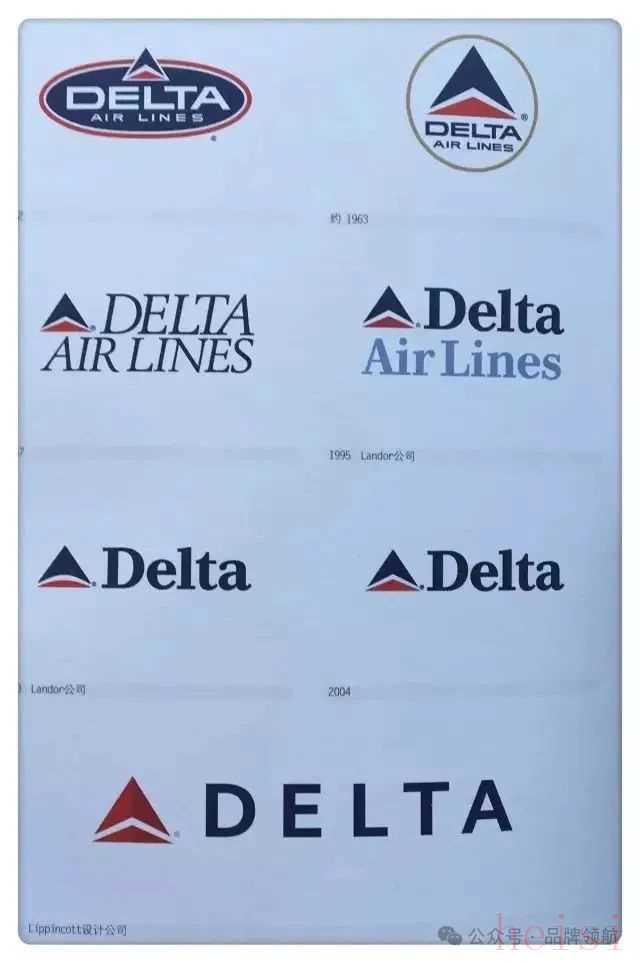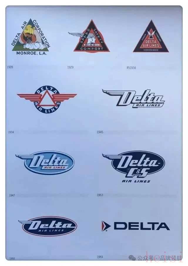 DELTA(达美航空)达美航空的 logo 演变围绕 “飞行” 这一核心意象,从具象到抽象,不断强化品牌的速度与稳定感。1928 年,前身公司的 logo 是单引擎飞机配 “Delta” 字样,充满早期航空业的冒险感,直观展现行业属性。1953 年,合并后采用 “三角形翅膀” 设计,倒三角形代表希腊字母 “Δ”(Delta),两侧延伸的翅膀线条流畅,象征飞行的速度与稳定,将品牌名与航空属性巧妙结合。2000 年,合并西北航空后,翅膀图案加入柔和的波浪线条,颜色从红蓝两色改为深蓝色配红色 accents,更显沉稳,体现了规模扩大后的稳重。2018 年,为纪念百年诞辰,logo 去除文字,仅保留简化的翅膀图形,线条更锐利,红色部分收缩为三角形尖端的点缀,强化 “全球领先航空” 的简洁有力形象。这种演变让达美航空的 logo 始终紧扣航空主题,通过形态的优化适应不同发展阶段。