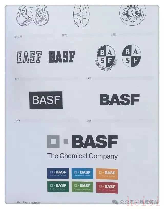 BASF(巴斯夫)巴斯夫的 logo 演变展现了化工企业从工业形象向科技与人文结合形象的转变,核心是从复杂徽章到抽象图形的简化。1865 年,成立初期的 logo 是复杂的徽章,包含工厂烟囱、齿轮与化学烧杯,直白展示化工企业属性,强调生产与技术。1922 年,logo 简化为 “BASF” 字母配红色菱形边框,字体严谨,体现化学工业的精确性。1996 年,推出 “雪花” logo,由 6 个彩色圆点组成的抽象雪花图案,取代纯文字标识,不同颜色代表不同业务领域(红色 = 石油化工,绿色 = 农业,蓝色 = 化学品),圆点连接成网,象征产业链协同。2018 年,雪花图案边缘加入渐变效果,色彩更柔和,配合 “创造化学新作用” 的标语,弱化化工行业的距离感。这种演变让巴斯夫的 logo 从工业符号转变为更具亲和力与科技感的形象,传递出 “与环境共生” 的人文关怀。