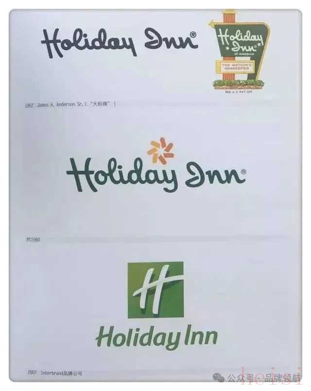 假日酒店假日酒店的 logo 演变围绕 “像家一样的旅馆” 这一核心定位,不断增强品牌的亲和力与全球辨识度。1952 年,第一家假日酒店的 logo 是绿色屋顶的建筑剪影配 “Holiday Inn” 手写体,建筑剪影与酒店外观相呼应,直观展现了品牌的行业属性,绿色则传递出舒适、宁静的氛围。1963 年,合并后推出的 logo 加入 “伟大的美国旅行酒店” 标语,建筑图案简化为三角形屋顶配圆形门窗,色彩改为黄蓝搭配,更易在公路旁被识别,适应了当时汽车旅行的兴起。1983 年,洲际酒店集团收购后,logo 去掉建筑图案,采用红色 “Holiday Inn” 字体配蓝色地球图案,凸显全球化布局,红色象征热情服务,蓝色代表全球。2016 年,“动态笑脸” 设计出现,字母 “i” 的点改为黄色笑脸,字体倾斜 10 度,增添活力感,笑脸符号在不同文化中具有普适性,解决了跨国酒店品牌的情感沟通难题,让假日酒店的品牌形象更具亲和力与国际化。