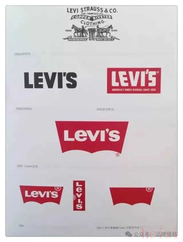 李维斯李维斯的 logo 以双马标和 “Levi's” 字样为核心,双马标象征着产品的耐用性,最初用于证明其牛仔裤能够承受两匹马的拉力。早期的 logo 较为复杂,随着时代的发展,逐渐简化。1936 年,“Levi's” 斜体字标出现,字体设计更加流畅、动感。到了现代,logo 以简化的红旗标为主,红色象征着热情、活力,与品牌的经典形象相契合。这种演变既保留了品牌的历史传承和核心象征意义,又通过简化设计增强了现代感和传播效率,让李维斯成为了牛仔裤的代名词。