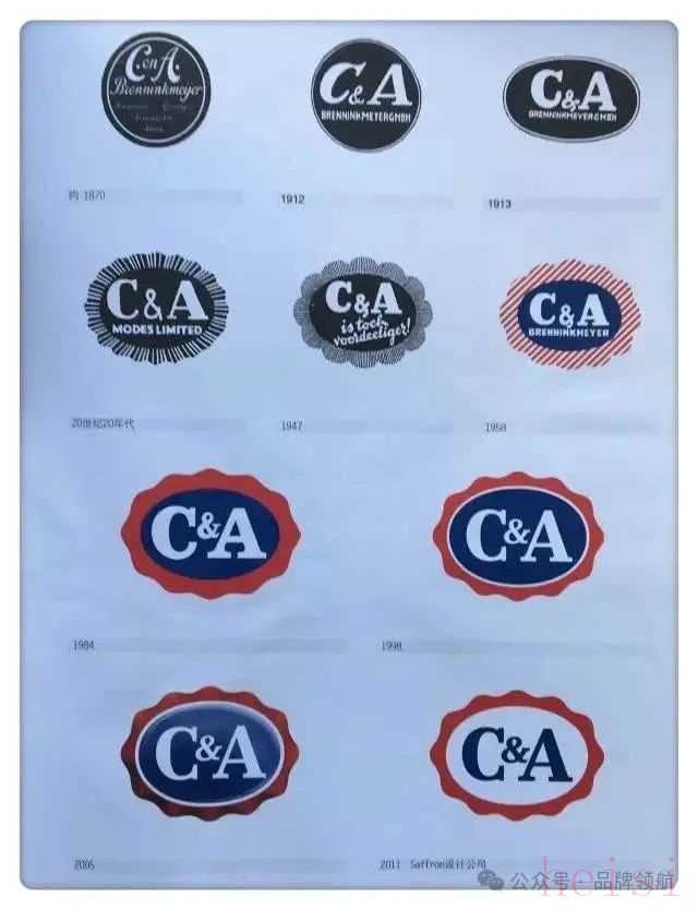 C&AC&A 的 logo 演变体现了平价时尚品牌在全球化进程中对品牌形象的塑造,核心是 “C&A” 字母组合的简化与统一。1841 年,品牌创立初期的 logo 是 “Clemens & August” 花体字,带有贵族气息,与当时经营高级面料的业务相符。随着业务转向平价服饰,logo 逐渐简化为 “C&A” 无衬线字体,去除了装饰性元素,凸显了 “实惠、简约” 的品牌定位。1960 年代全球化扩张时,C&A 在不同国家推出了本地化变体,如德国市场用黑色字体,法国市场加入蓝色下划线,但 “C&A” 字母形态保持一致,既适应了区域市场的审美差异,又保证了全球品牌形象的统一性。2018 年,全球统一为黑白简约版,进一步强化了 “简约、百搭” 的服饰风格,让 logo 在各种零售场景中都能快速被识别,巩固了其在平价时尚领域的地位。