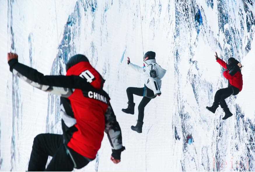 发布会现场富有科技感。入口处是一道由世界著名高峰的模型与图片组成的长廊,包括“世界之巅”珠穆朗玛峰、“欧洲之巅”厄尔普鲁士峰等,搭配冰晶模型营造出严寒极地的氛围。模特身穿登峰系列羽绒服出场的时候,以吊威亚的方式从舞台上空缓缓降落,随即又沿着雪山向上攀登,攀爬到“峰顶”之后,又速降到舞台中央。