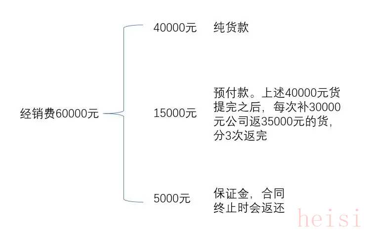 该6万元经销费除去5千元的保证金和4万元的纯货款,余下的1.5万元预付款要想全部拿回,需经销商再投入9万元。