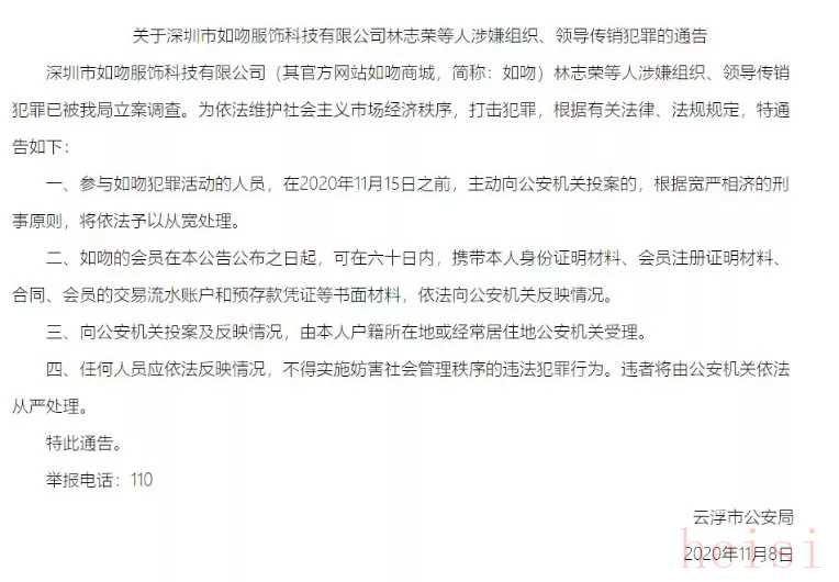 2020年11月8日,云浮市警方认定深圳市如吻公司该经销行为涉嫌传销,发出通告。