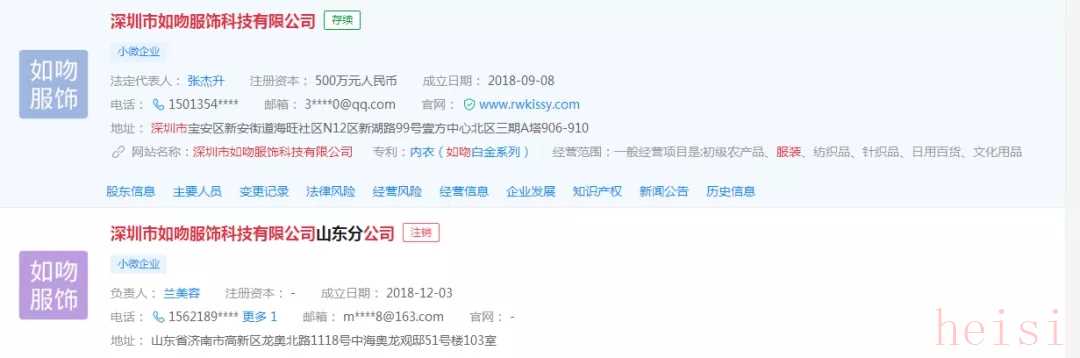 “Kissy”品牌内衣属于深圳市如吻服饰科技有限公司(下简称如吻公司),该公司成立于2018年9月8日,目前仍处在存续经营状态,而位于山东的子公司已于今年1月6日注销。