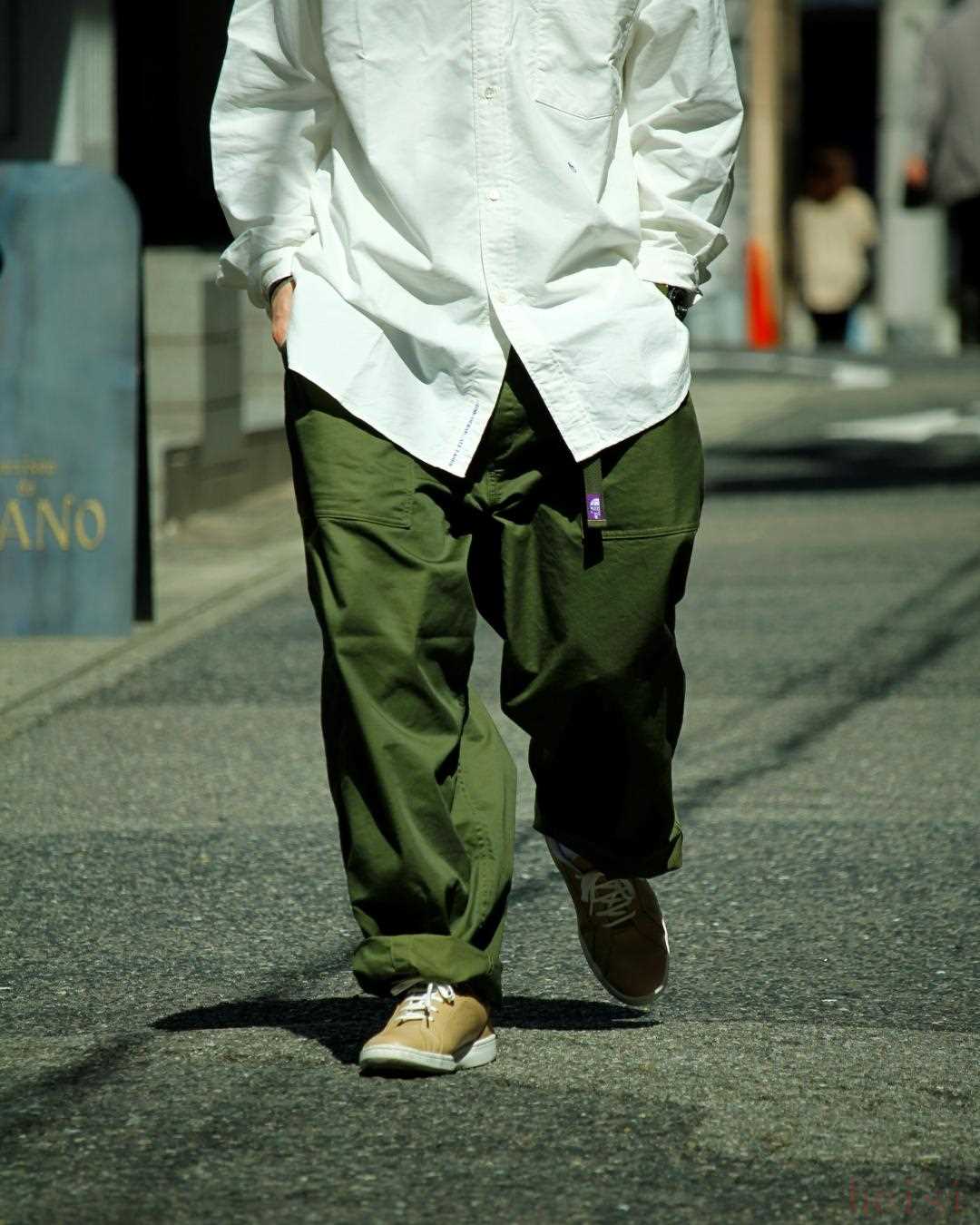 贝克裤的主要特点在于,它的裤腿两侧没有凸出的口袋,而是在正面设计了两个对称的矩形补丁贴袋,整体版型较为简洁利落,不像货物裤那么松垮。