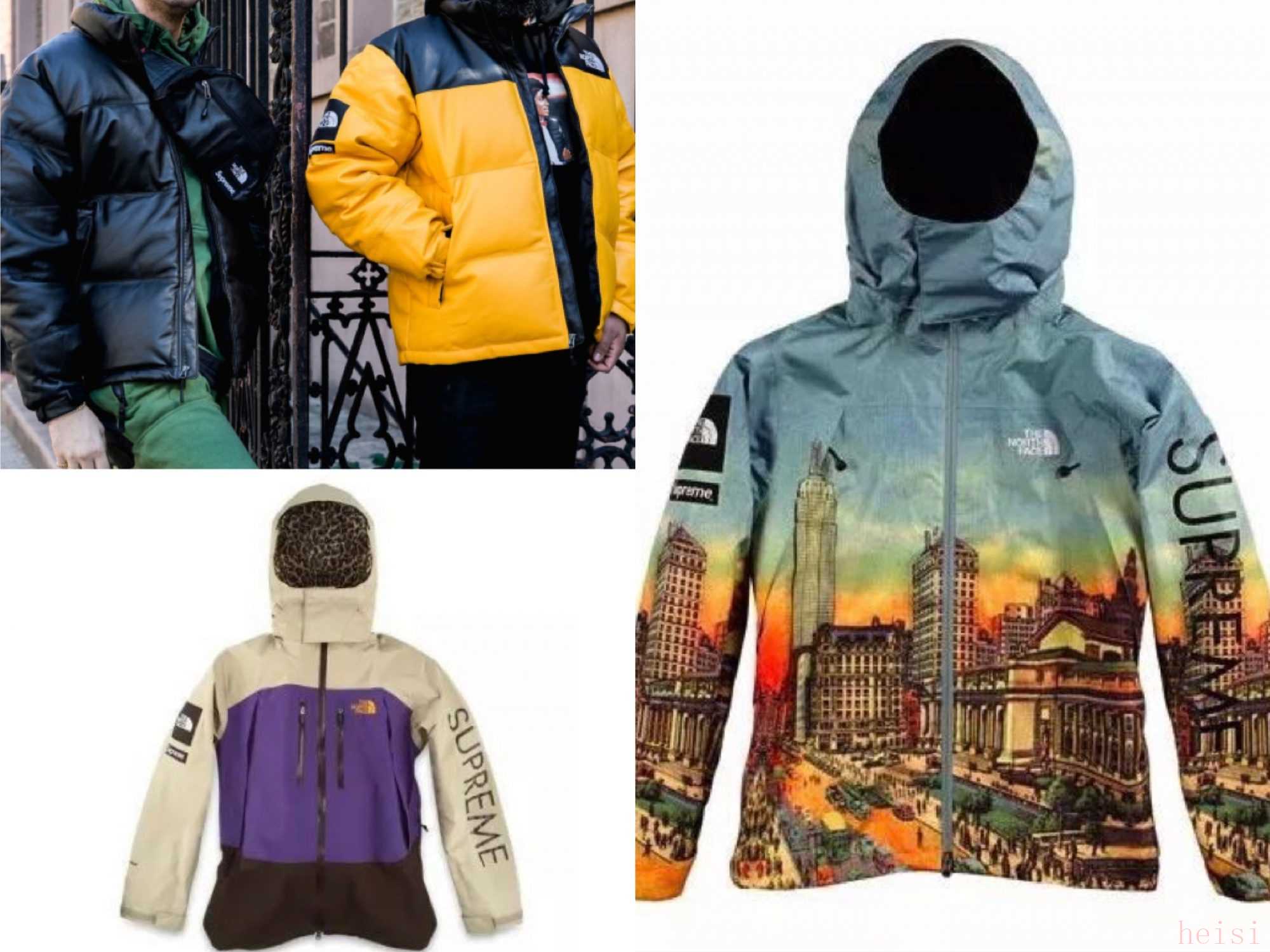 截止到2017年10月,双方十年间共计合作了19次,往往是 Supreme 使用意料之外的印花图案、面料、制作手法来重现 TNF 的经典产品,例如: