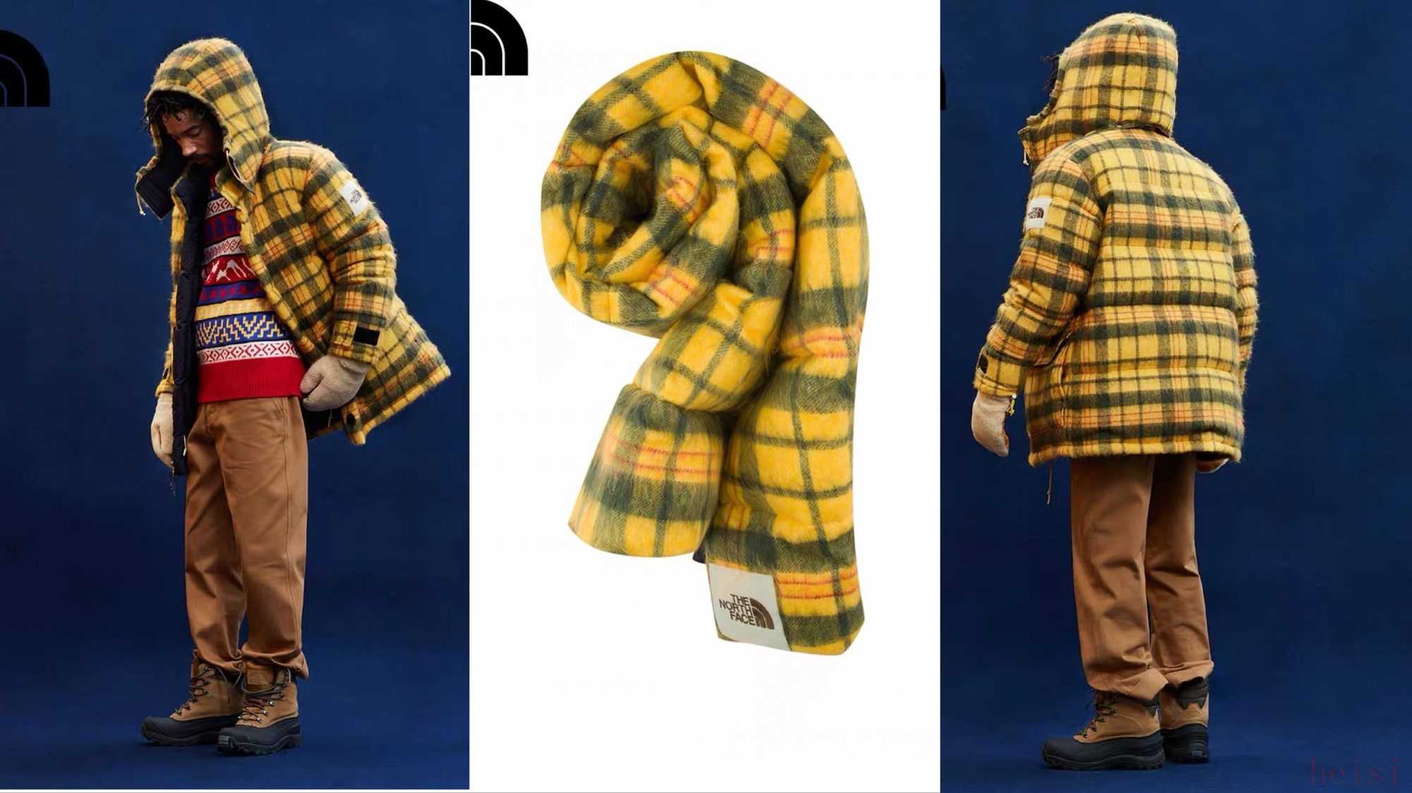 在紫标与英国面料品牌 Harris Tweed 的合作中,本间永一郎沿用了 TNF 的 Sierra 派克大衣、Nuptse 羽绒夹克等经典轮廓,再使用 Harris Tweed 的粗花呢格纹面料进行诠释,成功的将功能性登山面料与休闲运动装相结合。