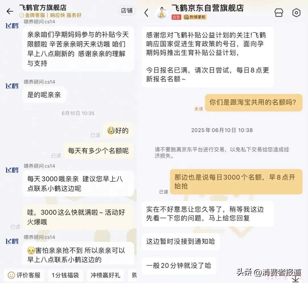 “线上领取渠道每日只开放3000个名额,每日早上8点后开始报名,名额先到先得,领完即止。名额一般前20分钟就派完了,建议早点联系客服领取。”飞鹤天猫及京东官方旗舰店的客服均向记者表示道。