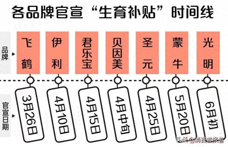 随着生育补贴热度持续升温,4月中旬,贝因美宣布了4万份限量礼包的“首期孕育补贴计划”。4月25日,圣元提出“百吨奶粉补贴直给”计划,蒙牛也在5月20日发布其“中国百万宝宝养育无忧普惠行动”(下称“普惠行动”)。6月初,光明的母婴渠道也推出“渠道共生”生育补贴计划。