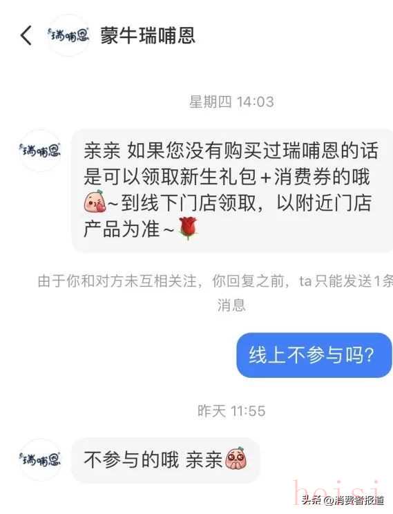 此外,蒙牛瑞哺恩官方客服也指出,该品牌的普惠行动仅限线下门店参与,各地门店的开放报名时间以及提供的产品或存在差异。