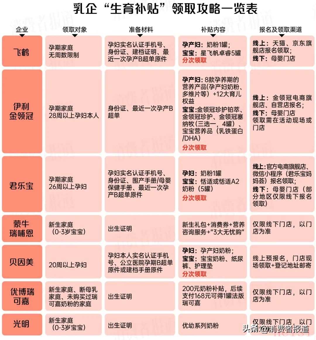 关于伊利、蒙牛等七大乳企发放“生育补贴”或提供孕产福利的消息,通常是指它们为了响应国家鼓励生育的政策,推出的针对消费者的优惠券、礼包或现金补贴等活动。