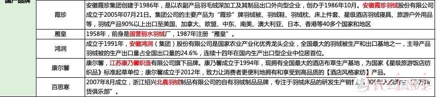 比如雁皇、霞珍、鸿润、康尔馨、百思寒,这些品牌也是羽绒工厂的自有品牌,且有将近三十年的历史——雁皇的前身是丽水国营羽绒厂,霞珍是安徽霞珍羽绒的自有品牌;鸿润也是安徽鸿润羽绒的自有品牌,鸿润羽绒被的出口量占全国出口量的25%;康尔馨是江苏康乃馨织造,康乃馨是国内酒店布草最大的供应商;百思寒是浙江北晨羽绒。