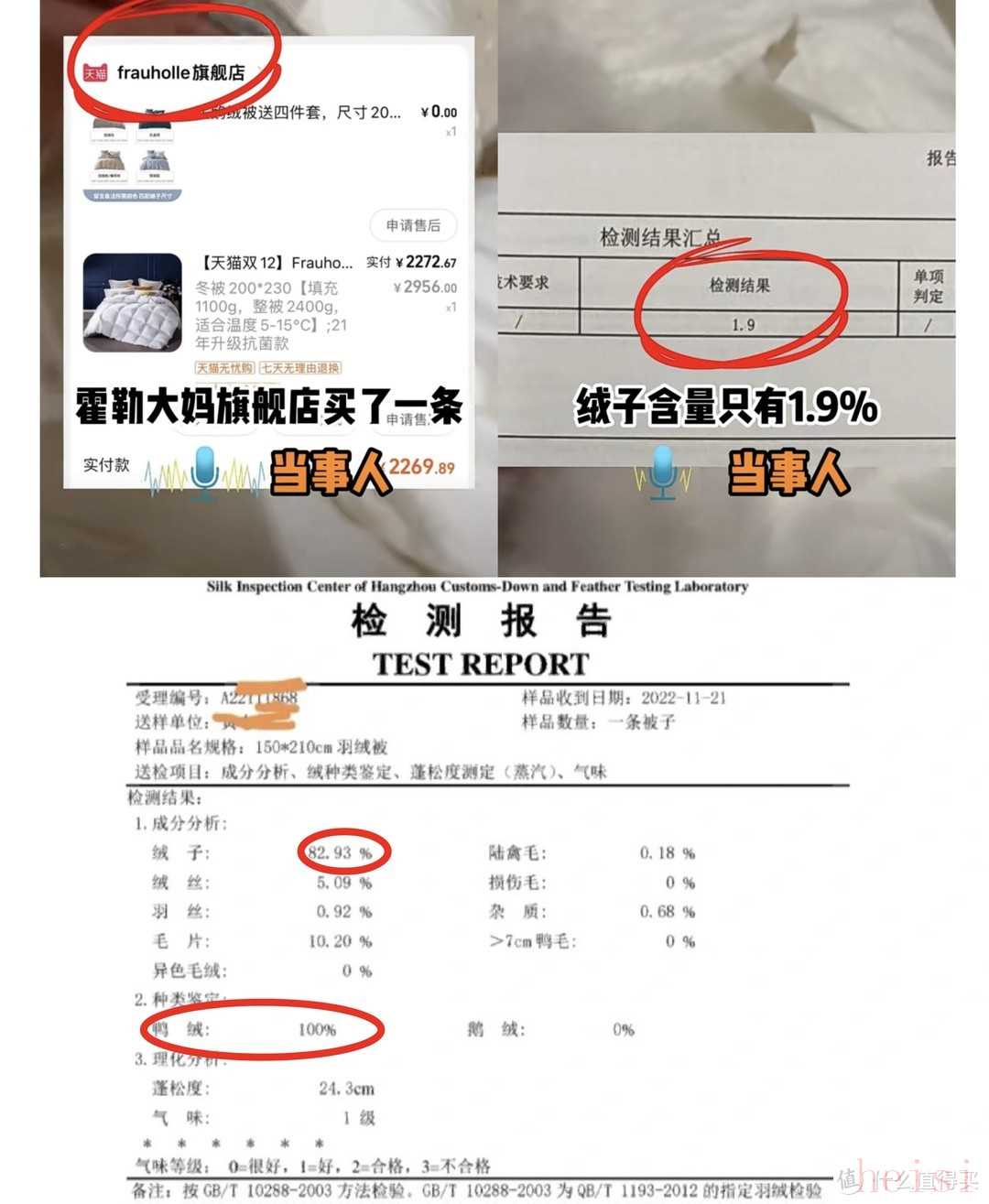 之前写过一篇揭露Frau Holle霍勒大妈的文章,这家宣称是德国进口的品牌,某书上各种笔记很多,京东天猫销量排名也是在水富罗之后,非常靠前。结果这个瑞士注册的牌子,经营范围跟羽绒被、羽绒枕没有半点关系;详情页上的各种认证,是德国Bettfedern und Bettwarenwerke GmbH帮其代加工后拿到的照片。背后的公司是南通某纺织公司,然后双十一暴雷了…… 据检测机构检测,宣称95%含绒量的鹅绒被,检测绒子含量仅有1.9%!还有一个检测出来是82%的鸭绒,令人目瞪口呆