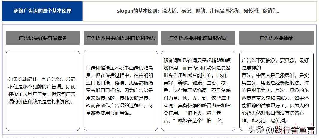 一、超级广告语的四个基本原理slogan的基本原则:说人话,易记,押韵,出现品牌名称,易传播,促销售。