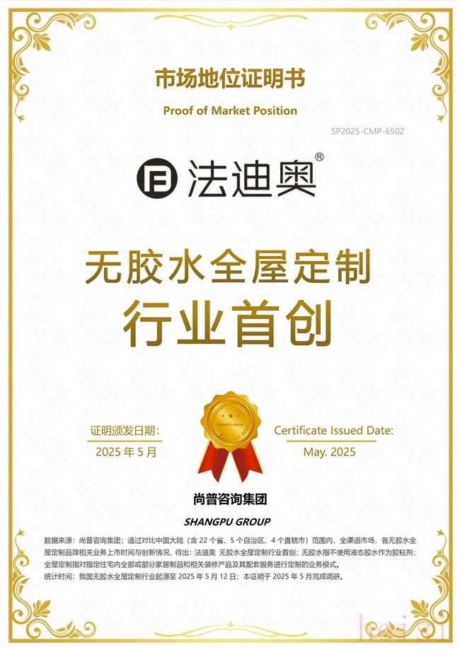 数据来源:尚普咨询集团;通过对比中国大陆(含22个省、5个自治区、4个直辖市)范围内,全渠道市场,各无胶水全屋定制品牌相关业务上市时间与创新情况,得出:法迪奥 无胶水全屋定制行业首创。统计时间:我国无胶水全屋定制行业起源至2025年5月12日;本证明于2025年5月完成调研。