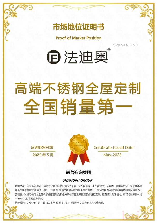 数据来源:尚普咨询集团;通过对比中国大陆(含22个省、5个自治区、4个直辖市)范围内,全渠道市场,各高端不锈钢全屋定制品牌销量情况,得出:法迪奥 高端不锈钢全屋定制全国销量第一。