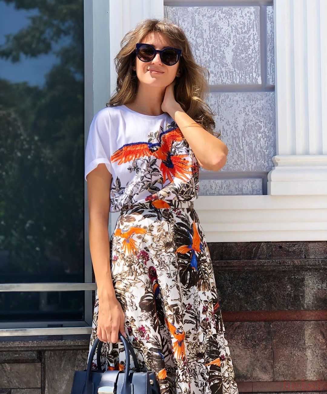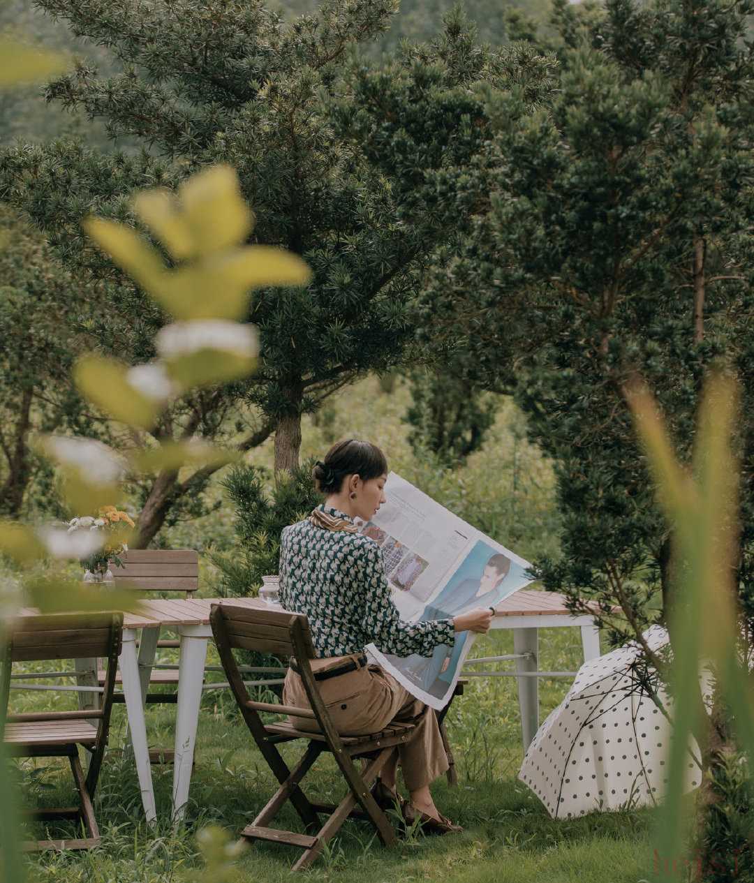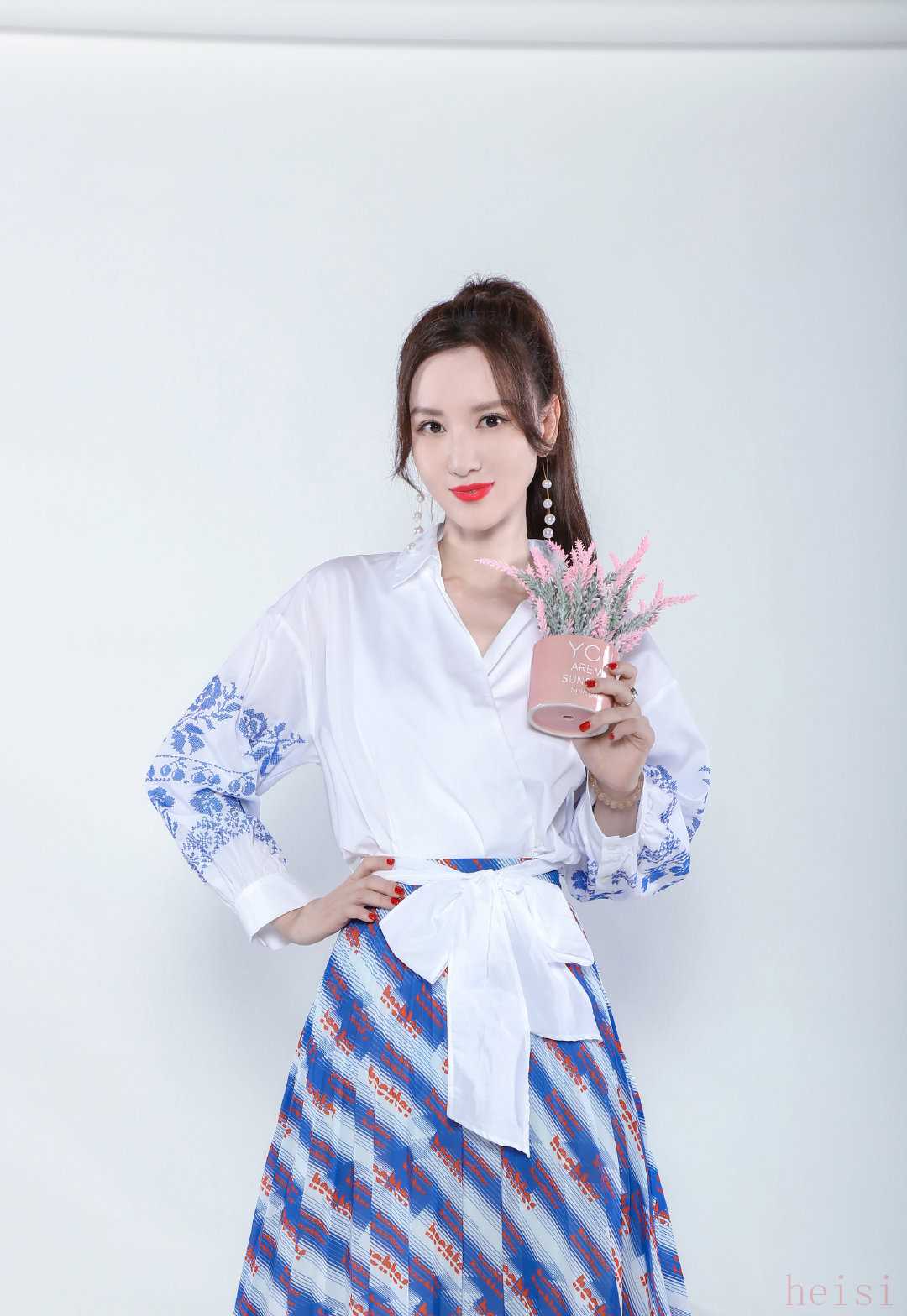 在后台开心的举着小花,印花A字裙和衬衫图案上下协调,裙子的褶皱和印花让weekend,比前两个副线少了点正经和端庄感,整个人十分娇俏,这不就是过下了班过周末的“老板娘”。