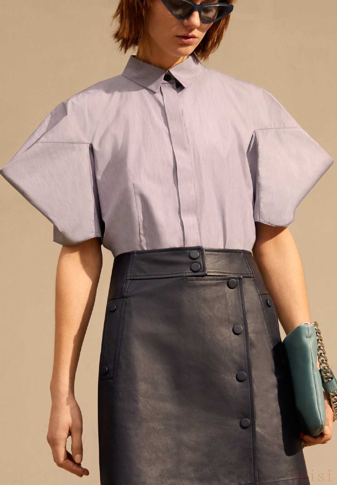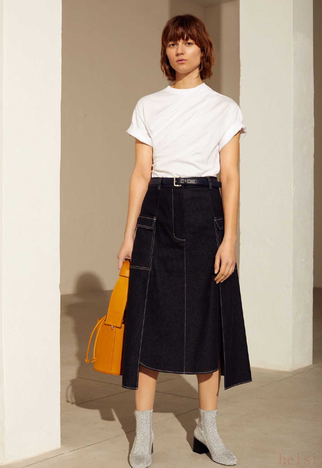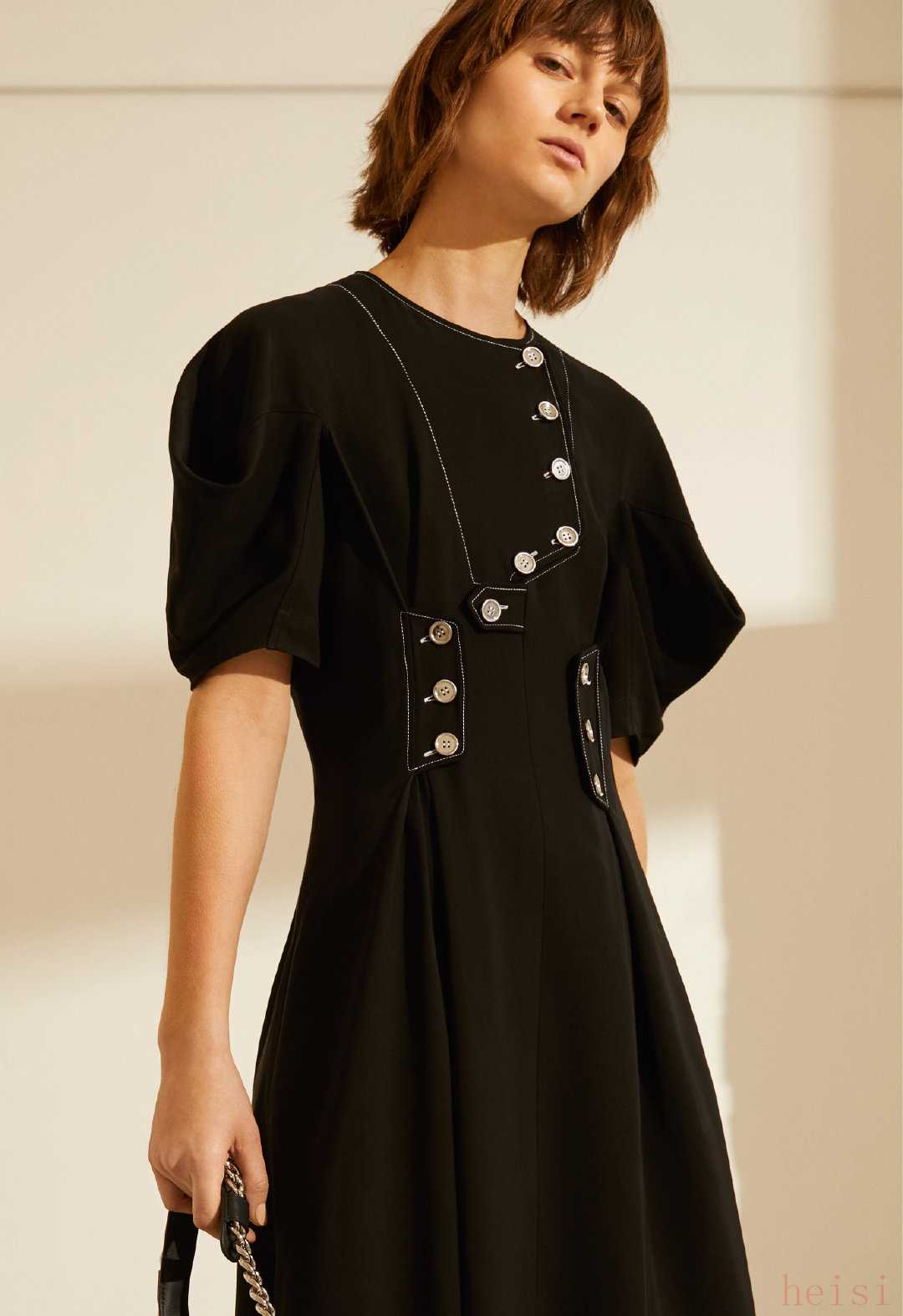 黑色裙子加入明线和扣子的设计,给人一种不羁的感觉,顺滑的裙摆和硬朗的褶皱结合,反而让整体设计更有意思。