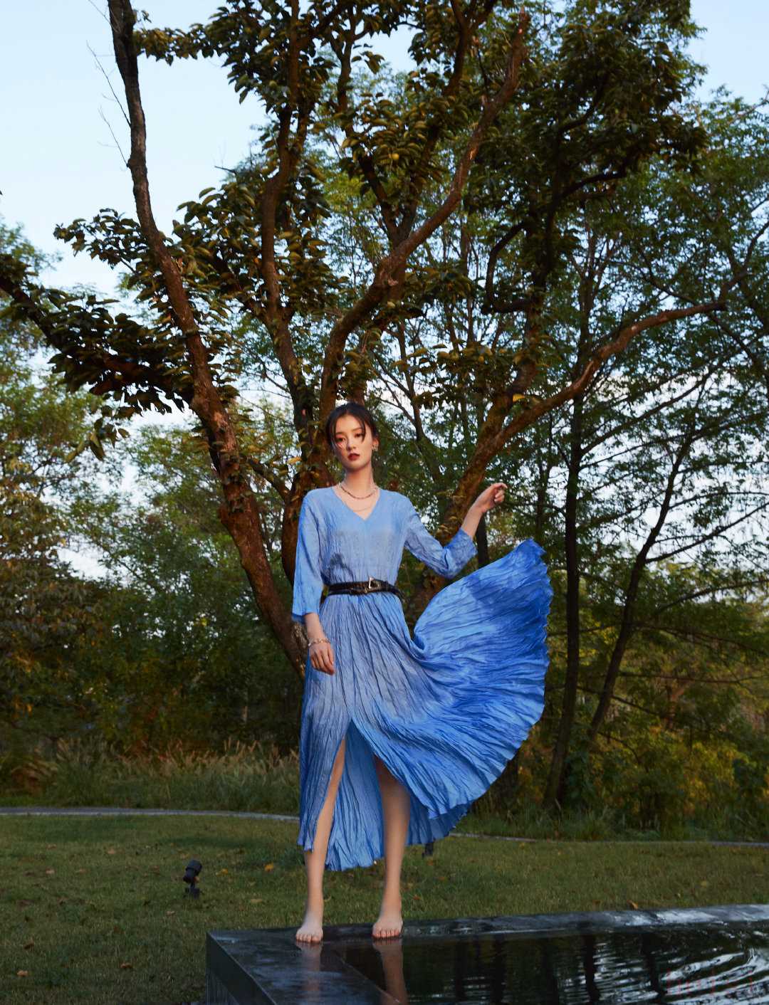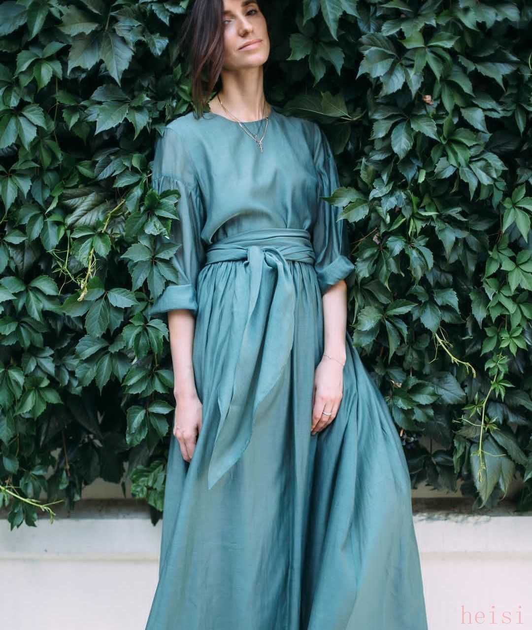 黑白色过于职业,卡其色没有亮点,这款蓝绿色裙子真的惊艳到我了,明明没有多余的设计,但是就是感觉整个裙子都是亮点,随意系的腰带,光滑但又有质感的面料,这可能就是S系的魔力。