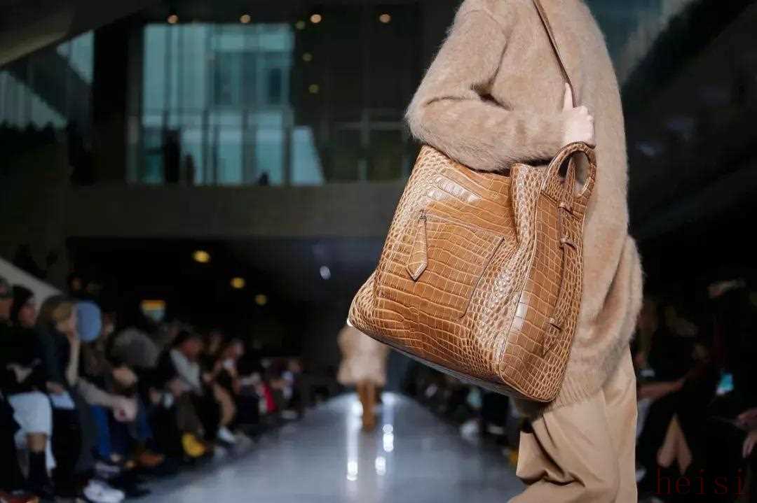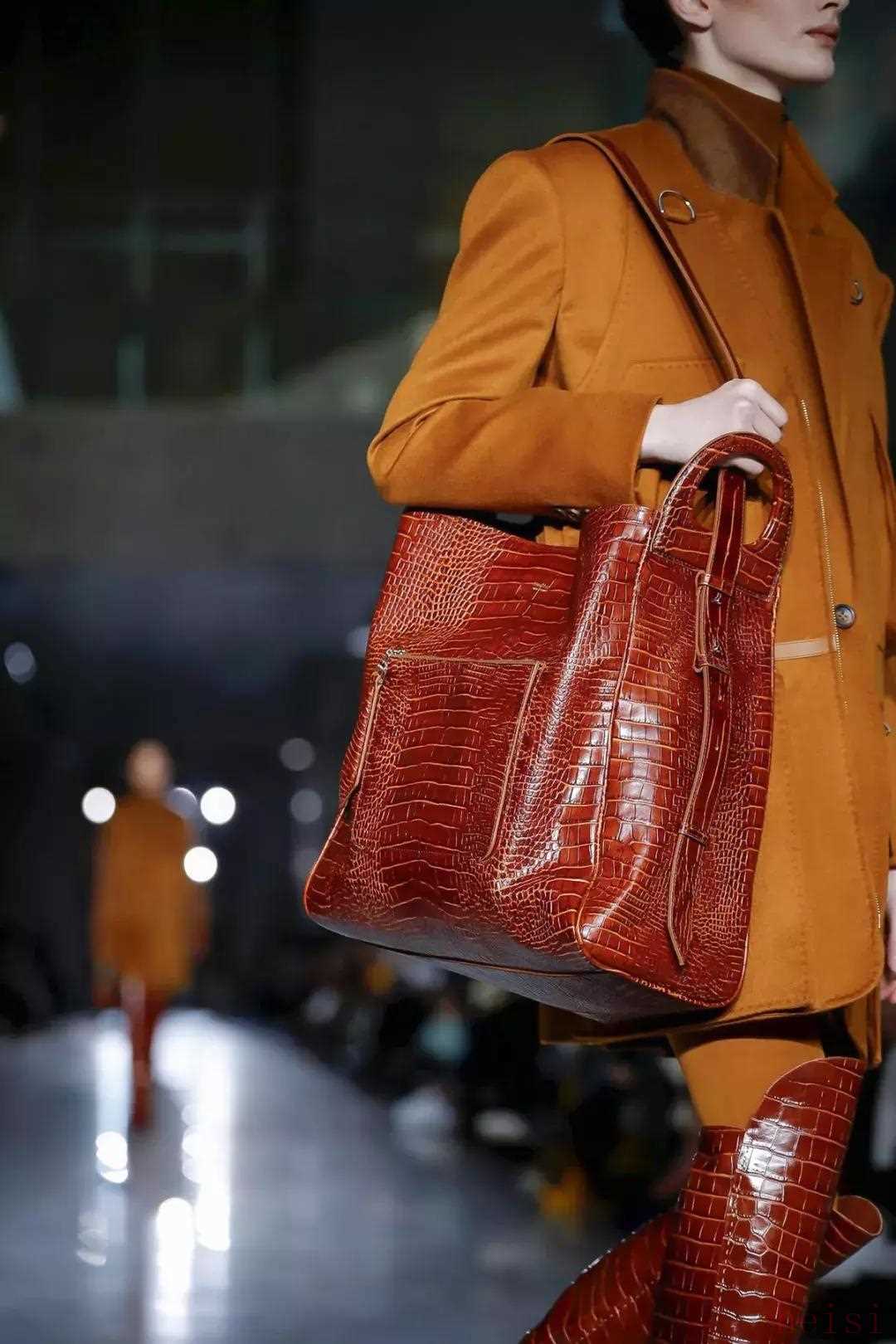本季鞋包以人造鳄鱼纹材质为主,人造鳄鱼纹看起来贵气十足,但实用性和定价都更亲民。