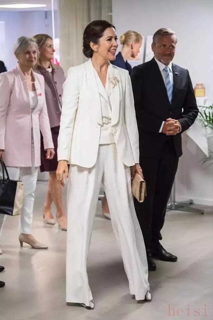 丹麦王储妃Mary Elizabeth Donaldson访问瑞典时穿着白色Max Mara套装,利落干练又不失亲切感。