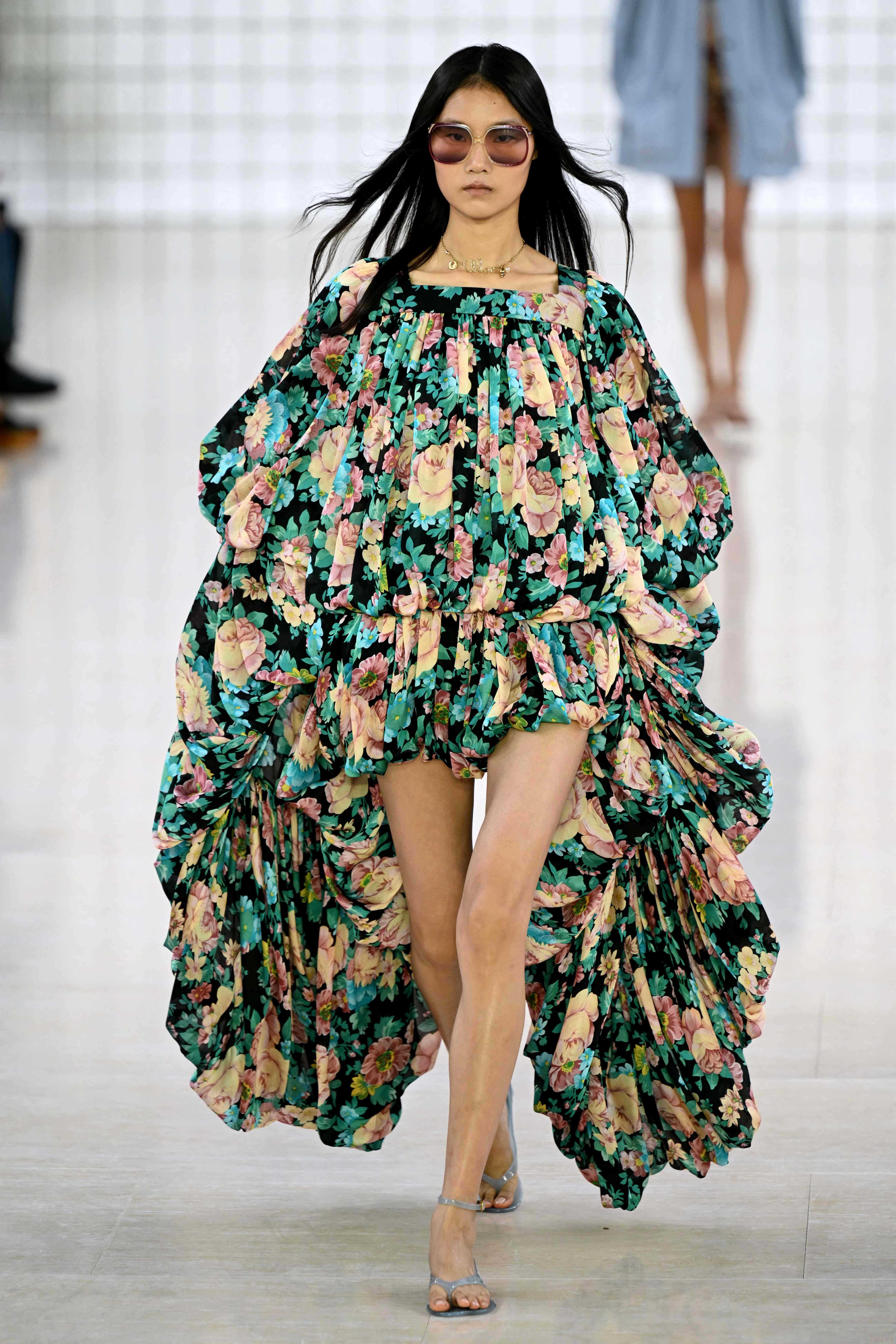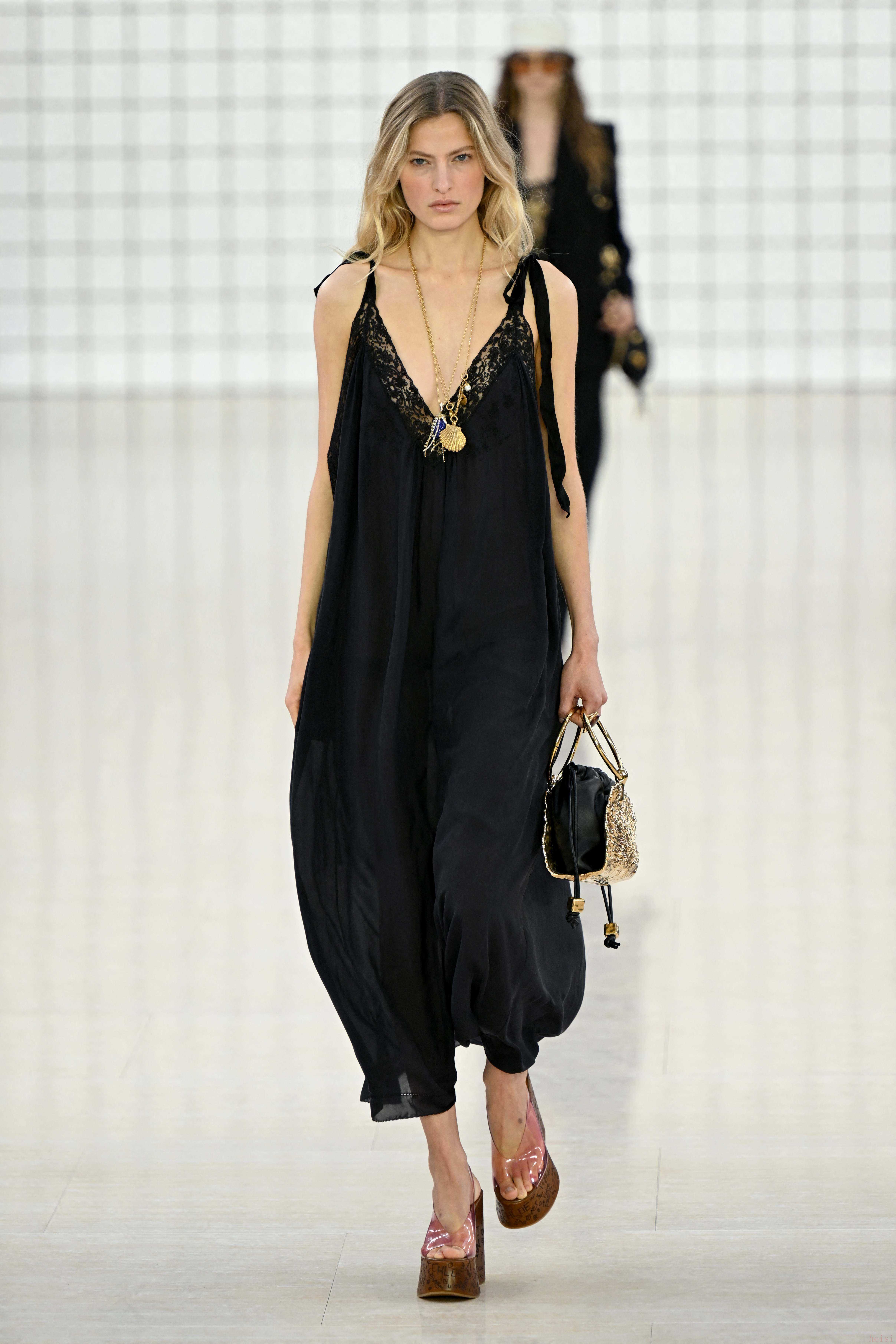 2. "现代廓形与复古韵味的融合:"秀场中出现了许多经过现代化解构的复古元素。例如,带有70年代韵味的A字裙被赋予了